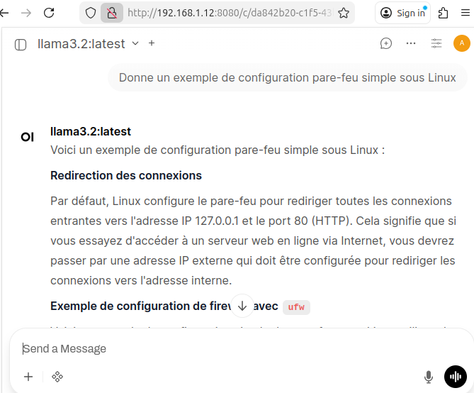 Les réponses sont générées localement par Ollama et affichées directement dans le navigateur.